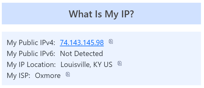 The easiest way to discover your external IP address, is to simply use the website https://whatismyip.com. If you go to that website, you'll see the following information:
